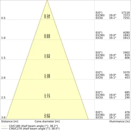 Der Abstrahlwinkel bezeichnet den Winkel, in dem das Licht aus der Lichtquelle ausgestrahlt wird. Er wird in Grad (D) angegeben. Je geringer die Gradzahl des Abstrahlwinkels ist, desto kleiner ist auch der Durchmesser des Lichtkegels, den die Lichtquelle produziert. Beispiel: Wird eine Lampe mit einem Abstrahlwinkel von 60 Grad an der Decke (2,5 m Höhe) angebracht, erzeugt sie einen Lichtkegel von 2,9 Metern Durchmesser. Hat die Lampe hingegen einen Abstrahlwinkel von 120 Grad, beträgt der Lichtkegel 8,7 Meter im Durchmesser. |