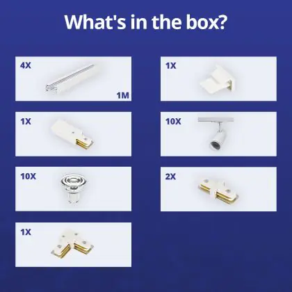 | Nom du fabricant | Complete L shaped 1-Phase Track Set White incl. 10x Spot fixture + GU10 2700K 3W Dim – 2 x 2 meters | |